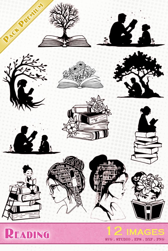 Pack contenant 12 images/fichiers vectoriels (SVG + SILHOUETTE STUDIO + DXF + EPS + PNG) sur le thème de la lecture. Vous y trouverez de nombreux motifs de livres ainsi que d’hommes et de femmes en train de lire.